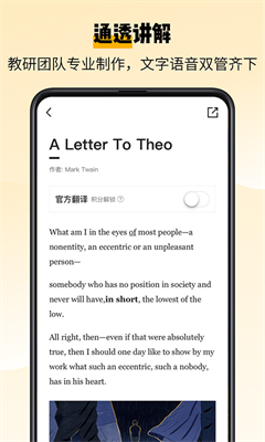 该应用整合了大量精选英语阅读材料,涵盖童话故事、流行小说、经典文学等多个类别,满足不同兴趣与水平用户的需求。每一个阅读单元都配有专业录制的音频,支持边听边读,强化听力与发音训练。同时,内置查词、笔记、生词收藏等功能,让您在阅读过程中实现一站式学习管理。