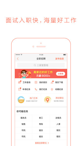 58同城是一个人人信赖的生活服务平台,海量生活信息免费查询、发布。在这里你可以租房、找工作、周边游信息等等,58同城在手,海量分类信息等你来看,欢迎有需要的用户来下载。