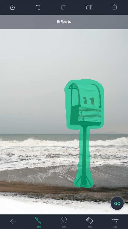 用删除物体工具去除照片上的干扰物 — 选择刷子或套索工具,标记想要删除的内容,然后点击Go按钮。