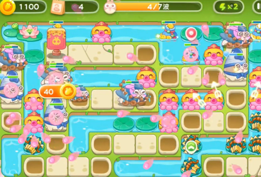 4、将中间的所有的荷叶上面都摆满章鱼碧昂且进行升级。
