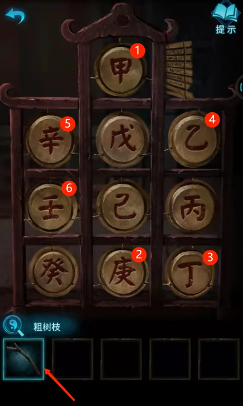 9、之后点击日晷,将罗盘上的字补齐,可以得到敲锣顺序甲、庚、丁、乙、辛、壬。