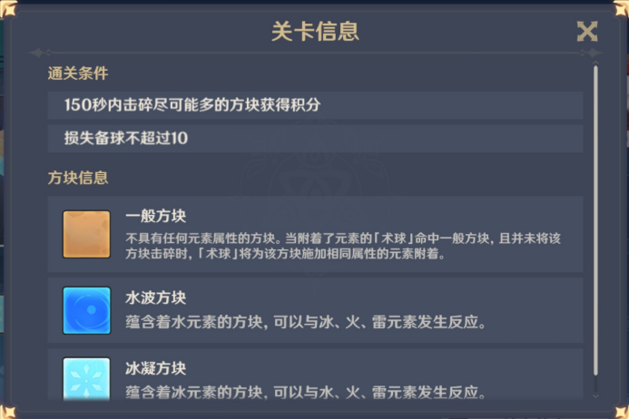 8、推荐角色:火元素/雷元素+冰元素角色。术球和弹板发生超导后,附加破坏效果[锐化]。冰属性术球和水元素游艺方块会产生[凝冻]效果。