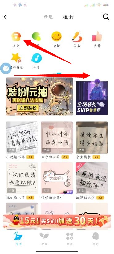 3、进入装扮页面往左滑,第一行有一个来电,点击一下。