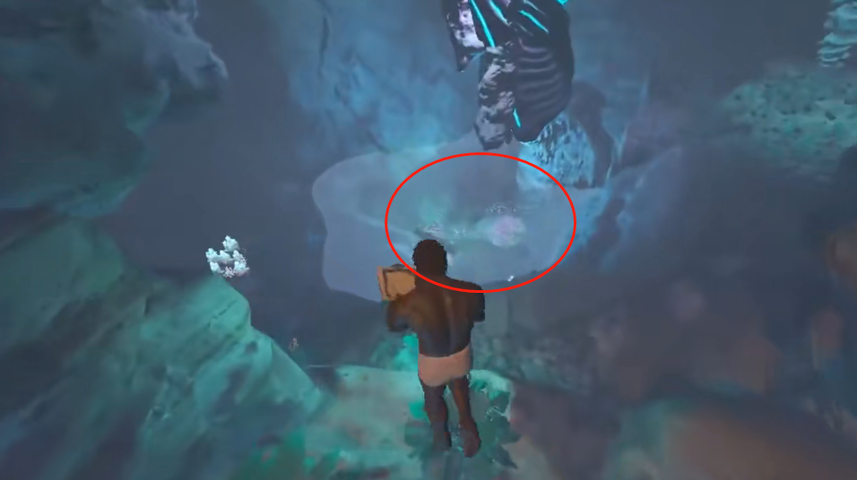 1、从水中出来后往前走,来到如图所示位置,之后我们跳下去走图中圈出来的洞口。