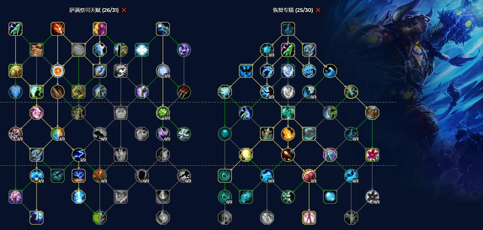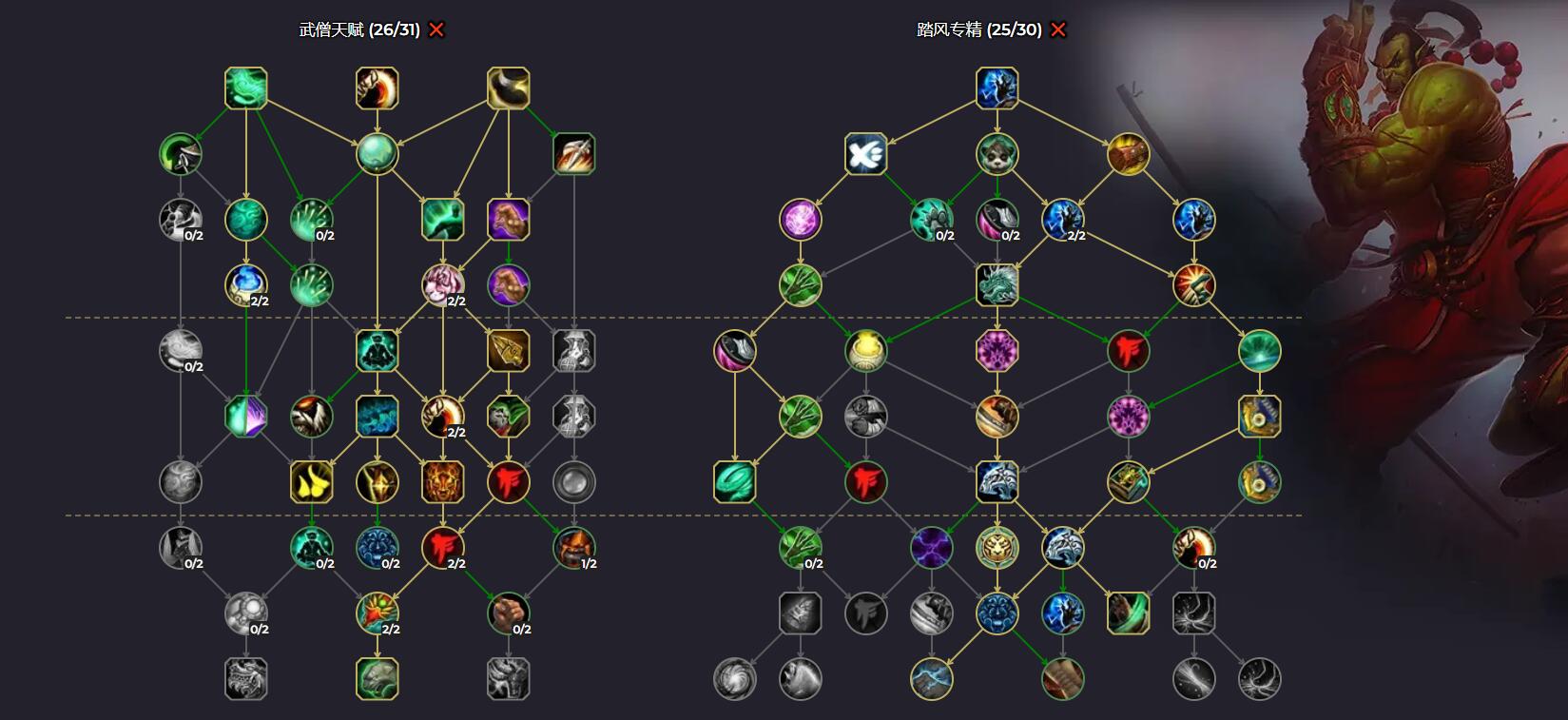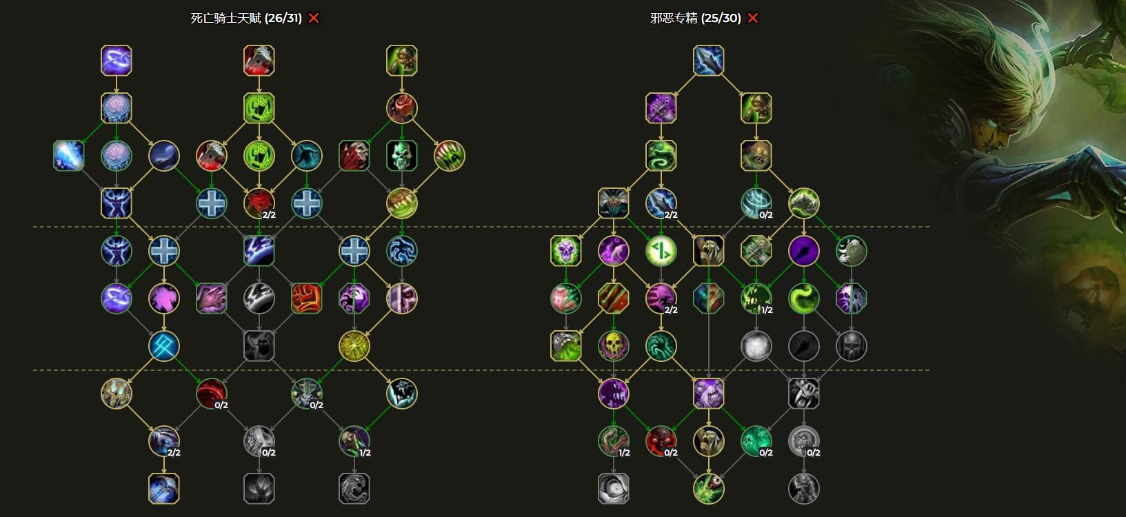 由于前夕等级只有60级,因此通用天赋树只有26点、专精天赋树只有25点天赋可用。加点如下图: