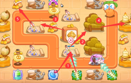 4、优先清理小的钱袋,这样有足够的金钱购买炮塔,之后清理大的钱袋,具体塔防如下图。