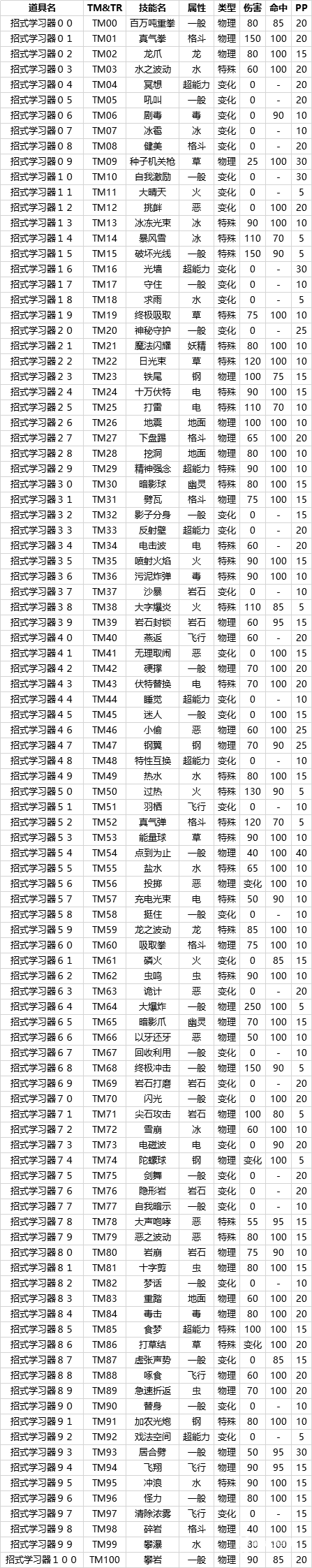 技能机器一览: