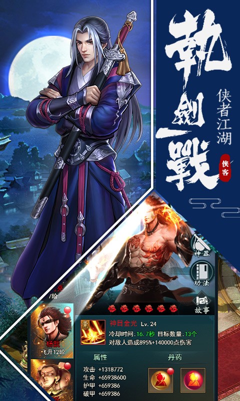 别树一帜的让历史中的人物向你传授各路绝学,和秦始皇修习王者剑法,和李白共舞青莲剑歌。万花宫、名剑山庄两大门派阵营,掌门争夺花落谁家?与红颜双修缠绵,收益加成大幅提升。更有炫丽的时装灵物等百种外观,圣殿、阴阳阁、天外江湖等诸多有趣玩法,与你共创精彩的武侠世界。丰富的职业、角色可供选择,全景大地图任你自由闯荡,更有酷炫技能特效给你畅爽游戏体验,还等什么?赶紧来约战吧!